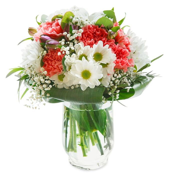 Like a joyful memory of spring along Leamouth's winding pathways, this bouquet dances with light and colour inside a crisp white gift bag-a beautiful offering ready to brighten someone's doorstep from the Wharf to Orchard Place. Soft coral and lively red carnations unfold ruffled petals in sumptuous layers, mingling with dainty white daisies whose golden-green centers glitter with cheerful assurance. Wisps of baby's breath lace the arrangement with airy softness, echoes of wildflowers found on lingering walks through Bow Creek's greenery. The look is deepened by a few shy purple-tipped buds arching on the left, inviting curiosity and a sense of growth. All the blooms nestle within a rich, shining ring of green foliage-broad and glossy leaves curving graciously as if to cradle the bouquet's heart. Impeccable attention to balance and fullness creates a sense of both celebration and comfort. The entire arrangement, captured with a crisp clarity against a white background, suggests new beginnings, heartfelt congratulations, or thoughtful 'just because' gestures. This bouquet, crafted by local Leamouth florists and available for swift delivery across E14, becomes more than simply flowers-it's a messenger of warmth, presence, and the natural beauty of East London living. This artfully arranged bouquet, a true celebration of renewal and connection, features radiant white daisies with sun-bright centers nestled among ruffled coral-pink carnations. Fleeting clouds of gypsophila, or baby's breath, impart a light, dreamy quality, and slender alstroemeria buds peep through-each tinged with pale purples and pinks reminiscent of spring evenings along the riverside in Leamouth. Eucalyptus leaves thread a silvery thread throughout the design, contrasting vividly with the vibrant blooms and reflecting the cool tones of the nearby Bow Creek. The palette is fresh, luminous, and soothing-perfect for occasions ranging from joyful birthdays to tokens of gratitude shared among neighbours near Leamouth Park. The round bouquet's exuberant yet tranquil energy makes it a beloved choice for welcoming guests into airy apartments or brightening creative workspaces nestled between the O2 and East India Dock. Created by skilled hands at Florist Leamouth, it is as much an expression of the local community's warmth as it is a visual delight-designed to capture life's happiest moments in every carefully chosen stem. This Leamouth bouquet captures the vitality and optimism of an East London spring morning-a vibrant collection of coral-pink carnations with delightfully ruffled petals, nestled beside radiant white chrysanthemums and daisies that open like little bursts of sunlight. Baby's breath weaves soft, cloud-like threads throughout, softening the bouquet and lending an uplifting airiness. Adding a gentle twist, a few magenta alstroemeria buds rest gracefully on one side, their unopened forms hinting at future blossoms. Lush, glossy green leaves form a collar at the base and push upward among the flowers, bringing freshness and a grounding touch reminiscent of the riverside gardens near Leamouth's Docklands. The clear glass vase, its water sparkling clean, reveals sturdy stems arranged with a practiced hand, underscoring the freshness and quality unique to local florists. Set against a pure white background under bright, diffused light, each petal's hue and each leaf's vein is vividly rendered, inviting warmth and serenity. This expertly arranged bouquet, ideal for new beginnings, heartfelt thank-yous, or simply celebrating everyday beauty, offers a piece of Leamouth's tranquil spirit to any recipient's doorstep.